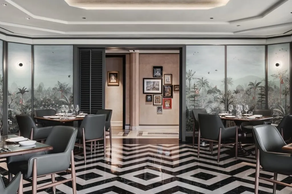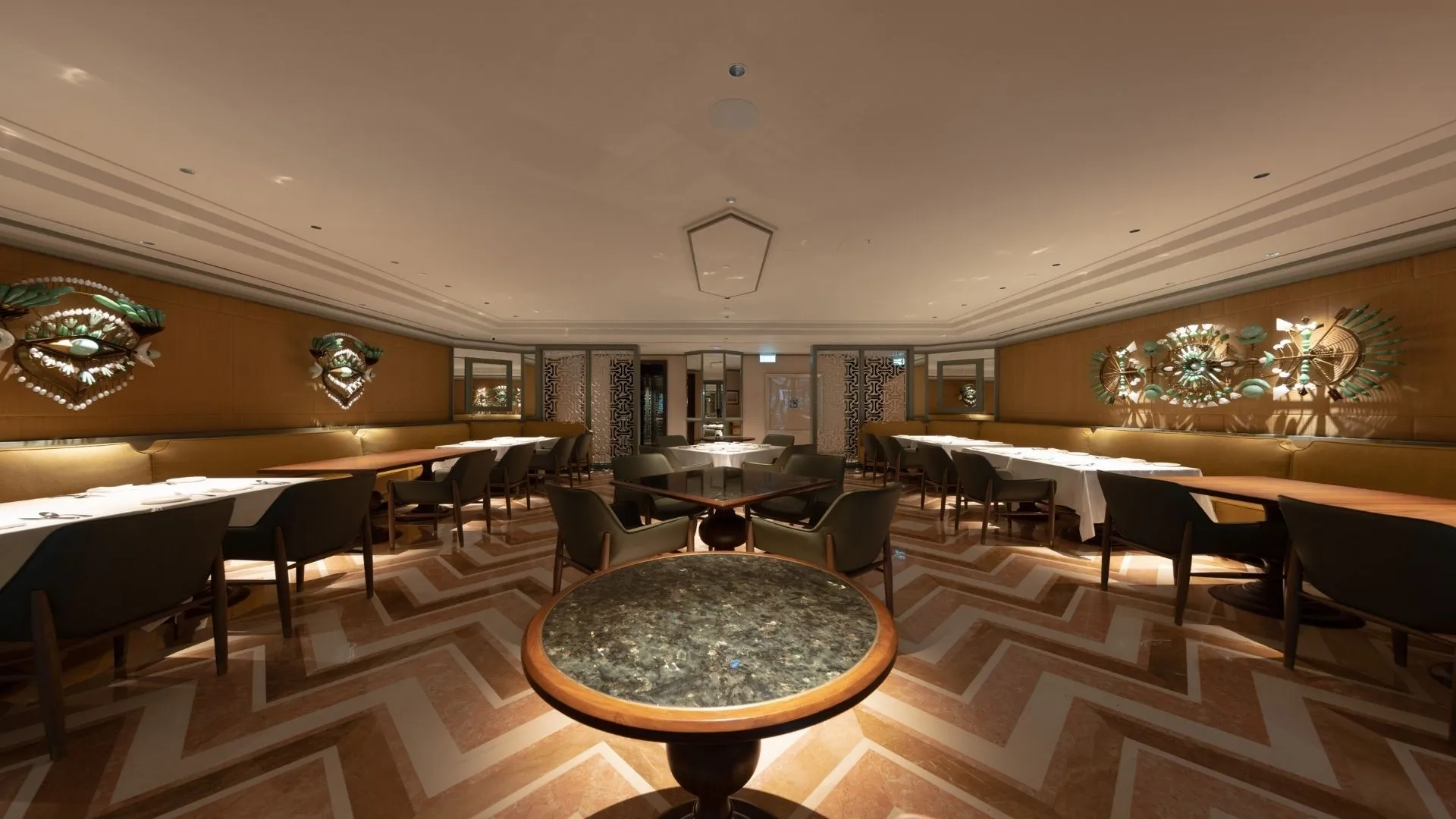 The interior of this project creates an immersive fine dining experience with its atmospheric ambiance. The space is characterised by rich tones, from the unique patterned flooring to the earthy interior and warm lighting to invoke a sense of tranquility.